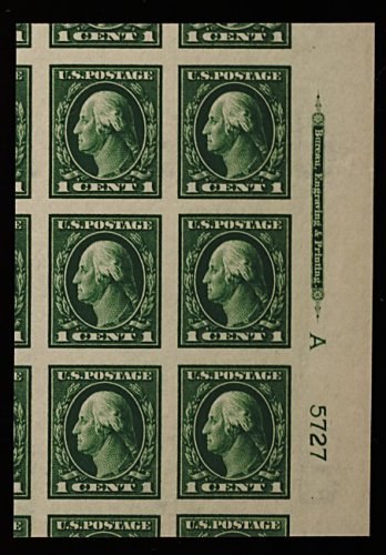 581 ogX 408 image#408, 1c Green imperforate, a very rare full right margin imprint, letter "A" and plate no. 5727 block of six, enormous margins all around having been cut from the sheet so that significant portions of nine adjoining stamps show, intense color, o.g., extremely fine; a surprisingly elusive plate block with a full imprint which, according to Martin A. Armstrong in his book Washington-Franklins 1908-21, exists "only through the remainders or excess sheets from the coil production. The majority of this lot had the right margins trimmed off and therefore a right side plate block showing the type-I imprint is extremely rare." (Image) 550.00
