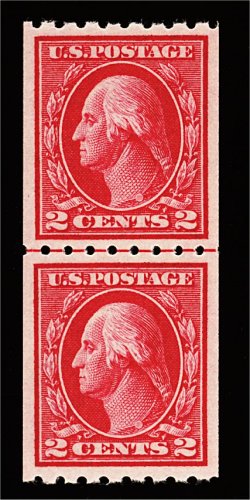 582 nh 411 image#411, 2c Carmine coil, Ty. I, perf. 8 1/2 horiz., guide line pair, possessing mathematically precise centering within large margins, gorgeous "fiery" color and a prooflike impression, immaculate o.g., n.h., superb; this line pair is the epitome of perfection; 1988 PF certificate. (Image) 92.50