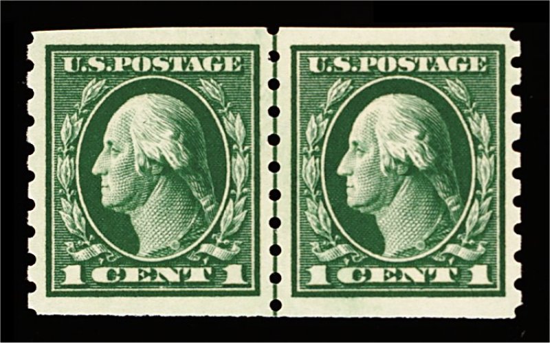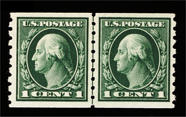 583 nh 412 image#412, 1c Green coil, perf. 8 1/2 vert., choice guide line pair, marvelously well centered within very large margins, deep luxuriant color, o.g., n.h., extremely fine; a line pair that is almost never encountered in this gem quality; 2000 PF certificate. (Image) 200.00