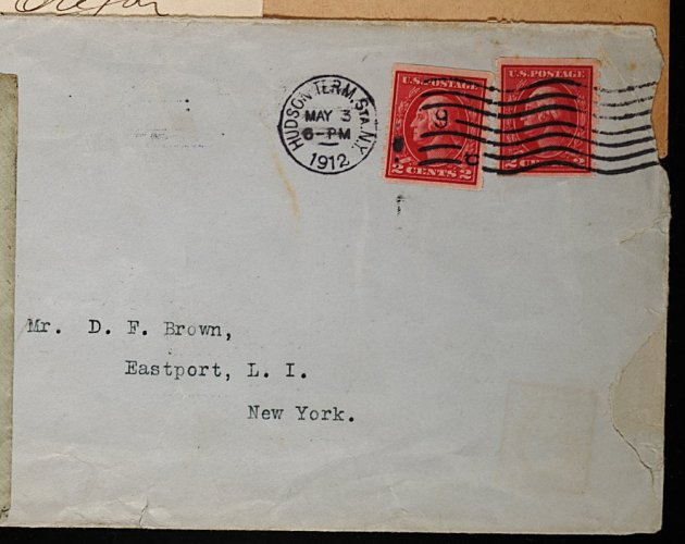 585 XXX 413 image#413, 2c Carmine coil, Ty. I, perf. 8 1/2 vert., two singles tied to legal sized "The World Building" illustrated ad cover to Eastport, N.Y. by "Hudson Term. Sta., N.Y./May 3, 1912" machine cancel, being the earliest known usage of Scott #413, Eastport backstamp, cover with couple of edge tears and light wear, fine; 2001 APS certificate; ex-Hart. (Image) Est. 200-300