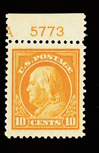 587 nh 416 image#416, 10c Orange yellow, a fabulous jumbo-margined top sheet-margin plate no. 5773 single, boasting the largest margins imaginable for this stamp, and being incredibly well centered within them, additionally this remarkable stamp's color is spectacularly intense and in a deep shade, o.g., n.h., extremely fine; an incomparable gem of immense proportions; 2000 PSE and 2001 PF certificates. (Image) 77.50
