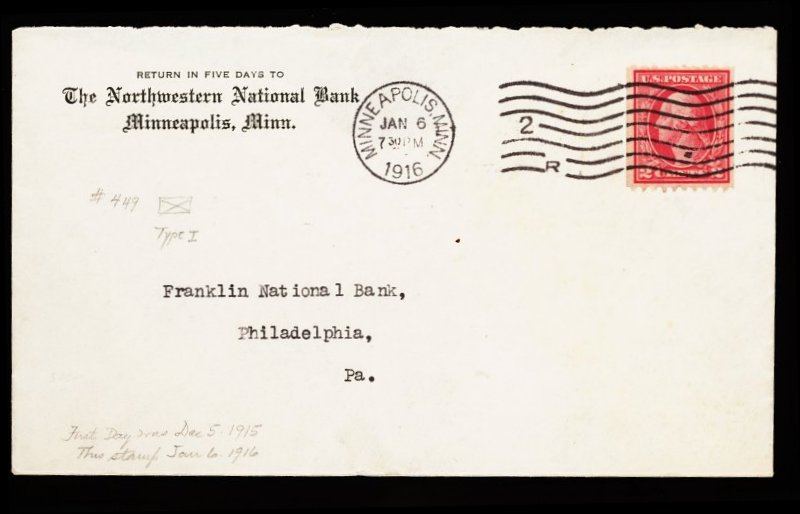 622 c 449 image#449, 2c Red rotary coil, Ty. I, perf. 10 horiz., choice well centered single, tied to attractive "Northwestern National Bank/Minneapolis, Minn." corner card cover by clear "Minneapolis, Minn./Jan 6, 1916" machine pmk., addressed to Philadelphia, the stamp, which has rich distinctive color, is extremely fine, the cover has its backflap removed and is very fine overall; very scarce and desirable Washington-Franklin cover; 1988 PF certificate. (Image) 1,050.00