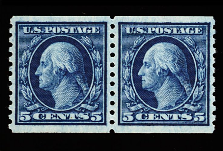 629 nh 458 image#458, 5c Blue rotary coil, perf. 10 vert., joint line pair, exceptionally well centered and margined, rich luxuriant color and crisp impression, o.g., n.h., extremely fine; a select quality line pair; 2001 PF certificate. (Image) 300.00