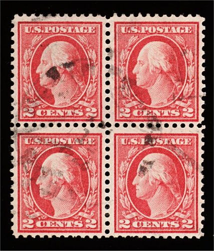 641 Obl 461 image#461, 2c Pale carmine red, an extremely scarce used block of four of a stamp that is one of the few in U.S. philately that is far more valuable used than mint, quite well centered, bright color distinctive only to genuine examples of this, light central strike of a large c.d.s., very fine; only a very small quantity of used #461 blocks are known, particularly certified; 1992 PF certificate. (Image) 1,250.00