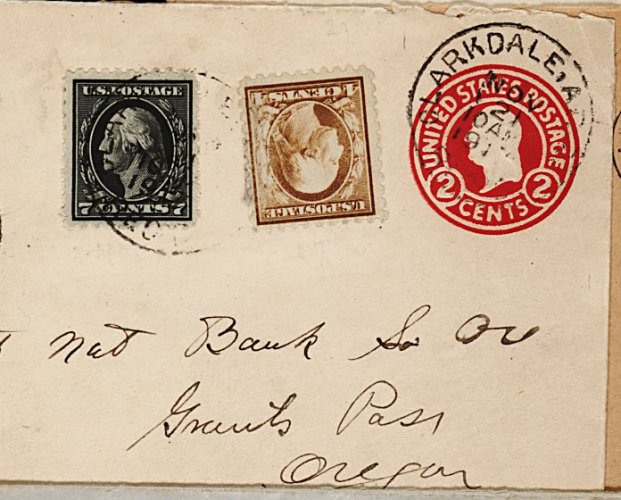 653 XXX 469 image#469, 7c Black, well centered single tied to 2c stamped envelope, along with 4c Orange brown (#465), to registered cover to Grants Pass, Oregon, three strikes of "Clarksdale, Ariz./Nov 21, 1917" c.d.s., representing the earliest known usage of Scott #469, magenta boxed handstamp at bottom left, along with straightline "Received in bad condition", undoubtedly referring to the tear at bottom of cover, 4c stamp with some facial rubbing, fine; any correct usage of the Seven Cent value is quite scarce, and especially so being an EKU; 2000 APS certificate. (Image) Est. 500-750
