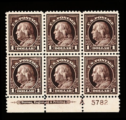 684 nhX 518 image#518, $1.00 Violet brown, an extraordinarily handsome and choice bottom margin imprint, letter "A" and plate no. 5782 block of six, possessing far better centering than typically encountered, with each stamp having large well balanced margins, rich luxuriant color and prooflike impression, brilliantly fresh, with strong and intact perforations, o.g., n.h., extremely fine; a high value plate block that is almost never encountered in this select quality; 1980 and 2000 PF certificates. (Image) 2,000.00