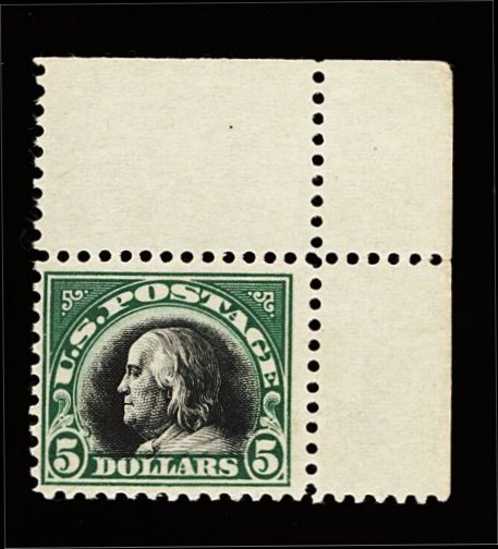 689 nh 524 image#524, $5.00 Deep green and black, top right corner sheet-margin mint single, quite fresh, o.g., n.h., fine. (Image) 350.00