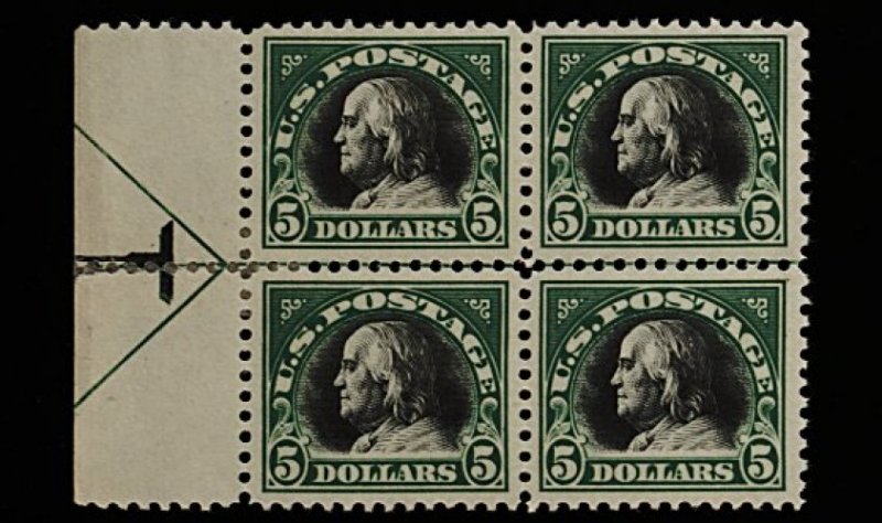 690 og/nhbl 524 image#524, $5.00 Deep green and black, left margin arrow block, well centered, rich colors, o.g., hinge reinforcing affects left stamps, right pair n.h., very fine. (Image) as singles 1,140.00