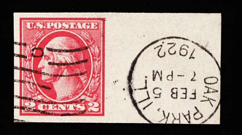 696 O 534B image#534B, 2c Carmine offset imperforate, Ty. VII, a spectacular right sheet-margin used example of this rare stamp, being in a quality virtually unlike any other we have had the pleasure to offer, sporting a huge sheet margin at right, and with the other three margins being large and well balanced, strong rich color and impression on bright paper, remarkably postmarked with "Oak Park, Ill./Feb 5, 1922" c.d.s portion of machine cancel perfectly positioned in the sheet margin, extremely fine; a superb used sheet-margin copy of the Two Cent Type VII offset imperforate; 1998 PSE certificate. (Image) 1,050.00
