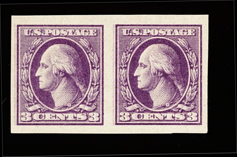 697 nh 535a image#535a, 3c Violet offset imperforate, double impression, choice mint horizontal pair, uniformly large margins all around, especially bright and fresh, o.g., n.h., couple of really trivial paper wrinkles, extremely fine. (Image) for hinged 200.00+
