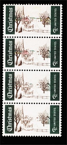 741 og 1384g image#1384g, 6c Christmas, red and yellow omitted, an extremely rare transitional vertical strip of four, showing a gradual loss of red, yellow and light green colors, starting at top and with the bottom stamp being the true error, as it has no traces of red or yellow colors, with only a tiny trace of light green, well centered, o.g., top and bottom stamps l.h., others n.h., choice very fine; less than ten errors are thought to exist and only a couple of transitional strips exist; 1992 PF certificate. (Image) Datz 2,850.00+