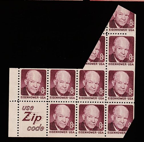 742 nhK 1395d var. image#1395d var., 8c Eisenhower booklet pane of seven plus "Zip" label, with striking foldover miscut at top right creating an extremely rare vertical pair, imperforate between, plus showing portions of two additional stamps (foldover creasing not affecting error pair), o.g., n.h., very fine; this error is unlisted in Scott and unpriced in Datz. (Image) Est. 500-750