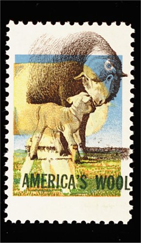 744 nh 1423b image#1423b, 6c America's Wool, teal blue omitted (intaglio "United States" inscription), a dramatic color missing error due to the strong shifting of the horizontal perforations, in addition, the offset colors are strongly misregistered contributing further to this stamp's striking appearance, o.g., n.h., tiny insignificant gum disturbed spot at top, very fine; a very rare error of which only six to eight are reported according to Datz, listed but unpriced in both Scott and Datz; 1998 APS and PF certificates. (Image) Est. 500-750