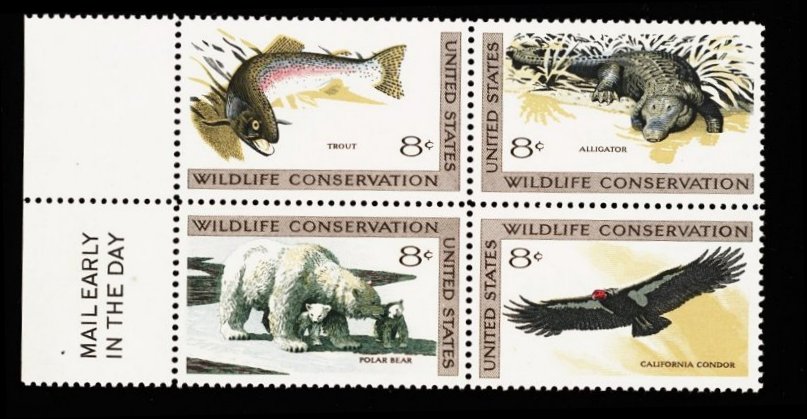 745 nhbl 1430b image#1430b, 8c Wildlife Conservation se-tenant block of four, light green and dark green omitted (from #1427 and #1428), left sheet-margin "Mail Early" inscription block of four, brilliantly fresh, exceptionally well centered, o.g., n.h., extremely fine; one of only eight known error blocks according to the Datz catalog; a most impressive color missing error; 1998 PF certificate. (Image) 4,500.00