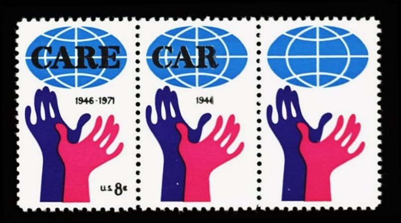 749 nh 1439a image#1439a, 8c CARE, black omitted, a very rare transitional horizontal strip of three, left stamp normal, the middle stamp with black partially omitted, and the right stamp with the black completely missing, o.g., n.h., extremely fine and visually striking; a major missing color error of which only ten are thought to exist; 1998 PF certificate. (Image) 4,750.00+