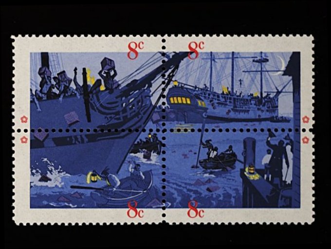 754 nhbl 1483b image#1483b, 8c Boston Tea Party se-tenant block of four, black (engraving) omitted, a well centered example of this striking missing color error, o.g., n.h., top right stamp with minor gum disturbance due to fingerprint, very fine; 1993 PF certificate. (Image) 1,500.00