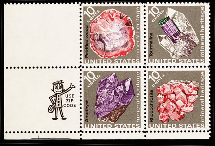 759 nhbl 1541b image#1541b, 10c Mineral Heritage se-tenant block of four, light blue and yellow omitted, bottom left corner "Mr. Zip" block of this rare error, of which only 24 to 28 se-tenant blocks are thought to exist, o.g., n.h., very fine; 1993 PF certificate. (Image) 1,900.00