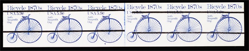 781 nh 1901b image#1901b, 5.9c Bicycle coil, imperforate, Bureau precancel lines only, a very scarce plate no. 4 line strip of six, showing break in precancel lines in middle of joint line pair, well margined, o.g., n.h., extremely fine; listed as a plate no. 4 strip in Datz but unpriced, catalogs $600.00 in Scott simply as three "normal" imperforate pairs. (Image) Est. 400-500