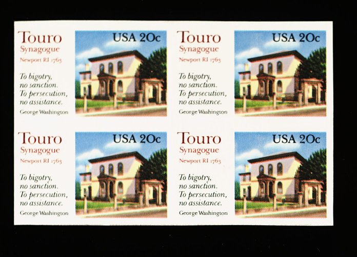 785 nhbl 2017a image#2017a, 20c Touro Synagogue, imperforate, a very rare mint block of four containing two error pairs, large well balanced margins, o.g., n.h., couple of very light fingerprints on gum, extremely fine; one of the rarest imperforate errors of the period, with only twenty-five pairs reported according to Datz; ex-Weisman. (Image) as two pairs 5,000.00