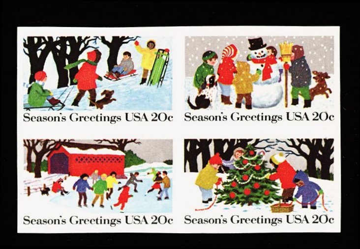 786 nhbl 2030b image#2030b, 20c Christmas se-tenant block of four, imperforate, choice well margined example of this rare and attractive error, of which only twenty are reported to exist according to Datz, o.g., n.h., one trivial fingerprint on gum, extremely fine. (Image) 2,750.00