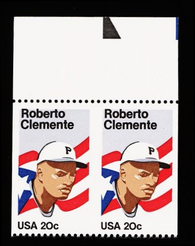 787 nh 2097a image#2097a, 20c Roberto Clemente, horizontal pair, imperforate vertically, handsome top sheet-margin pair of this popular baseball related error, well centered within large margins, o.g., n.h., light internal natural gum crease of little importance, extremely fine; only twenty pairs and three strips of three exist according to Datz; 1990 PSE certificate; ex-Weisman. (Image) 2,000.00