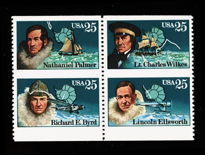 796 nhbl 2389c image#2389c, 25c Arctic Explorers se-tenant block of four, imperforate horizontally, select quality bottom sheet-margin example of this very rare missing perforation error, well centered, o.g., n.h., extremely fine; according to Datz, only ten intact se-tenant blocks of four exist. (Image) 3,000.00