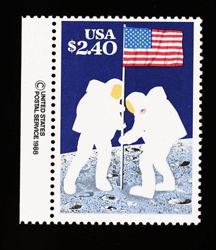 798 nh 2419a image#2419a, $2.40 Moon Landing 20th Anniversary, black (engraved) omitted, left sheet-margin USPS copyright single, well centered, o.g., n.h., very fine; a choice example of this popular space related missing color error; 1994 PF certificate. (Image) 2,500.00