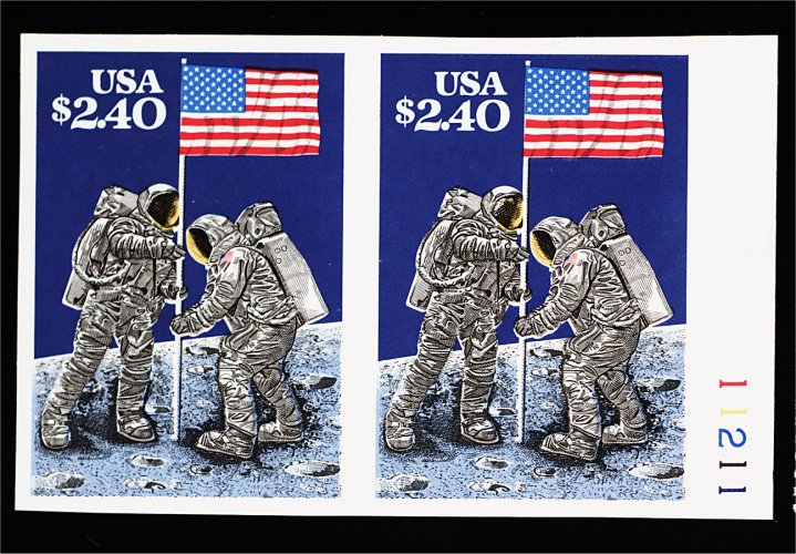799 nh 2419b image#2219b, $2.40 Moon Landing 20th Anniversary, imperforate, right sheet-margin plate no. 11211 horizontal pair, large margins all around, o.g., n.h., extremely fine and handsome. (Image) 750.00