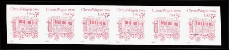 802 nh 2452De image#2452De, 5c Circus Wagon coil, imperforate, very scarce plate no. S2 strip of six, very well margined, with usual P.O. counting number on reverse of one stamp, o.g., n.h., extremely fine; this imperforate error is listed but unpriced in both the Scott and Datz catalogs. (Image) Est. 500-750