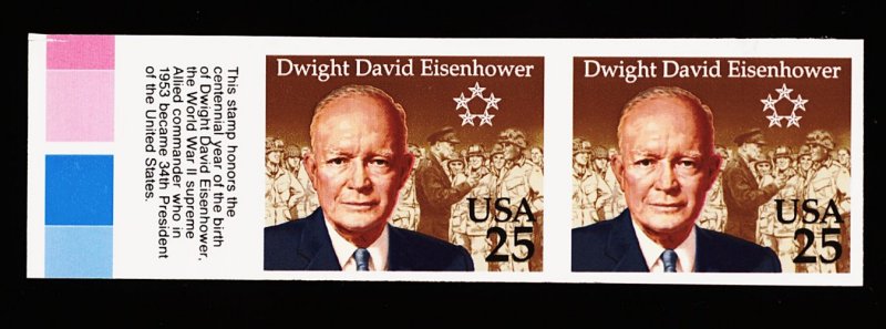 805 nh 2513a image#2513a, 25c Dwight Eisenhower, imperforate, choice left sheet-margin horizontal pair with marginal inscription, large margins all around, o.g., n.h., extremely fine; only twenty pairs recorded according to Datz; 1992 PF certificate. (Image) 2,250.00