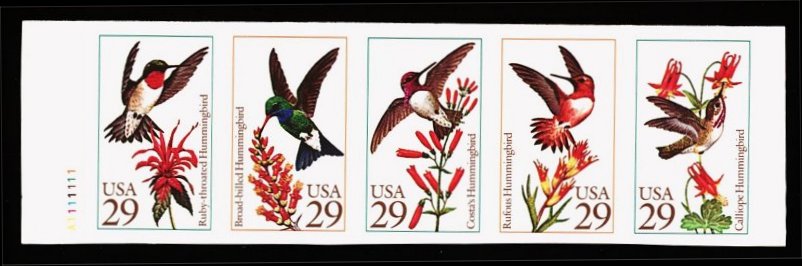 807 nhK 2646a var. image#2646a, 29c Hummingbirds booklet pane of five, imperforate, a very rare complete unfolded pane with plate no. A1111111 in selvage tab, o.g., n.h., extremely fine; a newly discovered major error which is unlisted in both the Scott and Datz catalogs; 2000 PF certificate. (Image) Est. 1,000-1,500