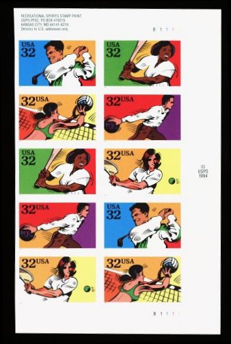 810 nhX 2965b image#2965b, 32c Recreational Sports se-tenant vertical strip of five, imperforate, a showpiece plate no. B1111 block of ten containing two error strips, huge margins all around, o.g., n.h., extremely fine; an important imperforate error rarity as only eight to twelve se-tenant strips of five are recorded according to Datz, with this being the unique plate block. (Image) as two strips 5,000.00+
