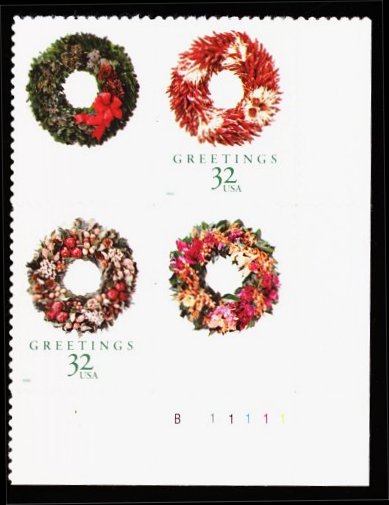 813 nhX 3252c image#3252c, 32c Christmas Wreaths se-tenant block of four, red inscriptions omitted on top left and bottom right stamps, a bottom right corner margin plate no. B1111 example of this rare and interesting missing colors error, still on original label backing, o.g., n.h., extremely fine; only one pane of twenty (five se-tenant blocks) has been recorded according to Datz; listed but unpriced in both the Scott and Datz catalogs. (Image) Est. 1,000-1,500