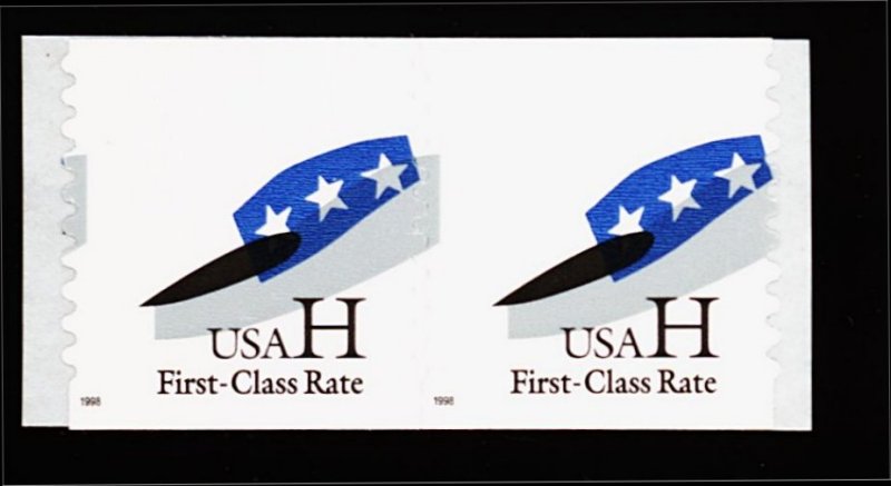 814 nh 3265b image#3265b, "H" Uncle Sam's Hat coil, red omitted, pair, additionally the blue and black colors are shifted slightly to right as is found on all known examples, still on original self-adhesive backing, o.g., n.h., very fine and striking; listed but unpriced in both Scott and Datz; 1999 PF certificate. (Image) Est. 500-750
