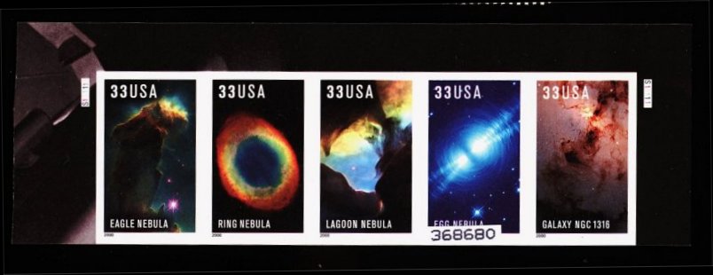 815 nh 3388b image#3388b, 33c Hubble Space Telescope Images se-tenant strip of five, imperforate, a choice horizontal strip of five from the top portion of the sheet with plate no. S11111 in margin, huge margins, o.g., n.h., extremely fine; a striking imperforate error which is listed in Scott but unpriced; 2001 PF certificate. (Image) Est. 750-1,000