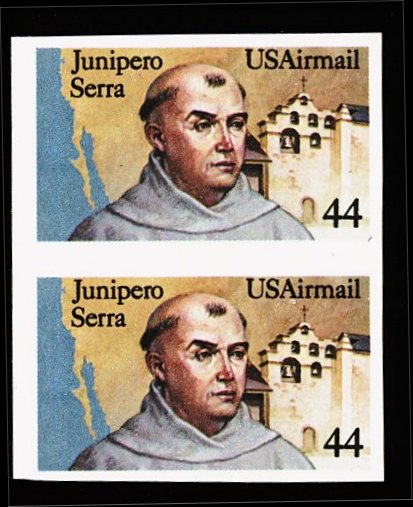 820 nh C116a image#C116a, 44c Father Junipero Serra, imperforate, vertical pair of this rare error, with only nineteen pairs recorded by Datz, well margined, o.g., n.h., choice very fine. (Image) 1,500.00