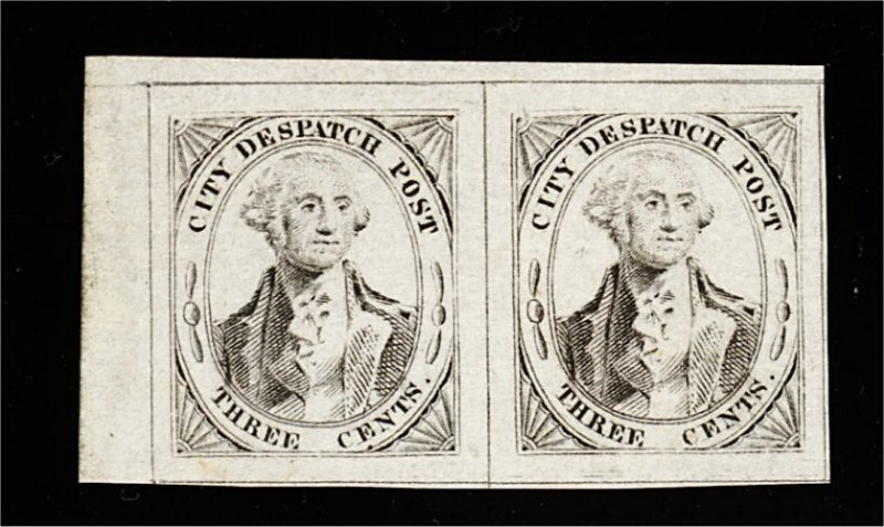 923 og 40L1 image#40L1, City Despatch Post 3c Black on grayish, a gem top left corner sheet-margin horizontal pair, boasting huge margins all around (including full frame lines around both stamps) and being incredibly fresh, excellent impressions on bright paper, full clean o.g., lightly hinged, a superb multiple of the first adhesive postage stamp ever issued in the United States; 2001 PF certificate. (Image) 850.00+