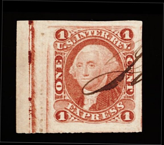 936 O R1a image#R1a, 1c Express, imperforate, a spectacular left sheet-margin used example in the finest condition possible, featuring a huge 9mm sheet margin which shows the centerline, other margins enormous as well, each being wonderfully well balanced, deep luxuriant color and a prooflike impression on bright paper, neat ms. cancel, superb; we are aware of no finer existing single; 1996 PF certificate; ex-Joyce. (Image) 55.00