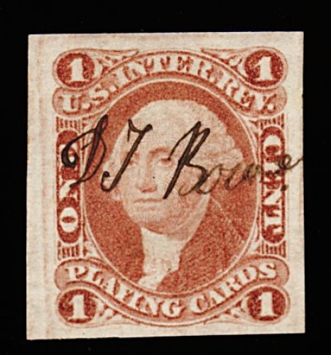 937 O R2a image#R2a, 1c Playing Cards, imperforate, a gem used example of this rare and very difficult stamp to find in such premium quality, possessing four lavishly large margins, sumptuously rich color and a strong impression on bright fresh paper, particularly neat ms. cancel, extremely fine in every regard; one of the finest existing singles of the imperforate 1c Playing Cards available; very few of the great revenue collections (including Chapin and Turner) had an example this choice; 1996 PF certificate; ex-Saylor. (Image) 1,050.00