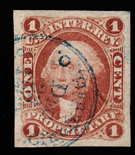 938 O R3a image#R3a, 1c Proprietary, imperforate, a magnificent quality used example of this very scarce first issue revenue, boasting several impressive physical qualities, not the least of which are its four extraordinarily large and perfectly balanced margins, gorgeous intense color and impression, all wonderfully complemented by a highly desirable blue handstamp cancel, an extremely fine gem in every regard; certainly one of the finest #R3a's in existence; 1995 PF certificate; ex-Joyce. (Image) 725.00
