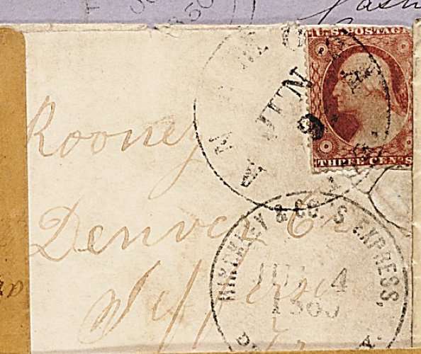 83 c 26 image#26, 3c Dull red, Ty. II, tied to small cover by mostly clear "Anamosa, Ioa./Jun 9" c.d.s., addressed to Denver City, Jefferson Ter(ritory), which was the provisional government of gold miners before the Territory of Colorado came into being, cover received in Denver on July 4, 1860 before it had its own P.O. established on August 30, with clear "Hinkley & Co.'s Express/July 4 1860/Denver City" circular handstamp applied upon arrival in Denver (very early usage of handstamp), with fascinating and poignant original enclosure datelined "Highland Grove" which gives the details of a devastating tornado which hit the area; stamp with faults due to having been affixed near the edge of the cover, small tear to cover at right not affecting markings, overall a fine and historical cover. (Image) Est. 750-1,000