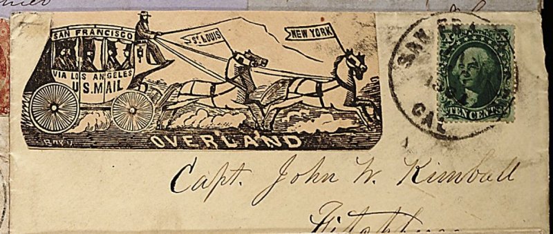 95 c 32 image#32, 10c Green, Ty. II, nicely centered, tied to yellow colored Overland Mail illustrated cover to Fitchburg, Mass. by "San Francisco, Cal./Jan 25 1861" c.d.s., fancy stagecoach illustration being a woodcut which had been cut out and affixed to cover, ms. "Via Overland Mail" at bottom left, accompanied by original enclosure which discusses California Civil War politics and military affairs in great detail, a very fine and choice historical cover. (Image) Est. 500-750