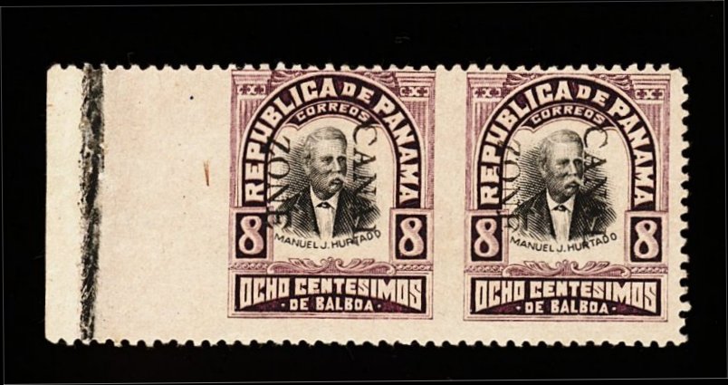 1014 og 25a image#25a, 8c Purple and black, horizontal left sheet-margin pair, imperforate between and at left margin, soft paper, 6.75mm spacing, while centered a bit to top as always, this is actually far better centered than any other example of this error we have seen, rich colors, o.g., l.h., fine; only 34 examples of this error are believed to exist; 2000 PF certificate (CZSG #25a). (Image) 2,000.00