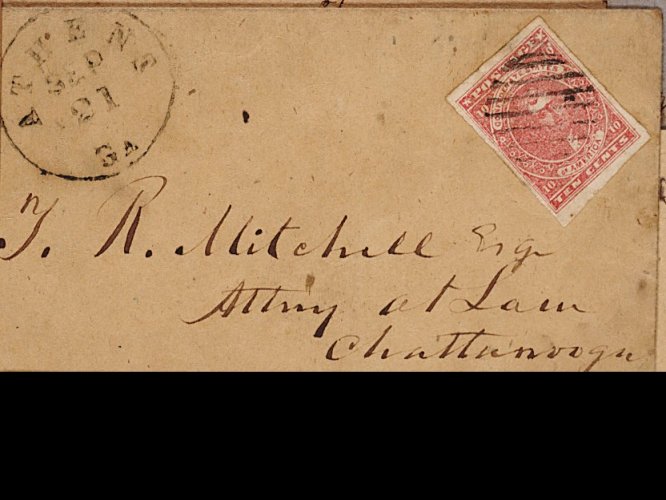 1221 c 5 image#5, 10c Deep rose, large to huge balanced margins, deep rose shade, cancelled by centrally struck circular grid with "Athens Ga./Sep 21" c.d.s. to left on homemade brown cover, addressed to T.R. Mitchell, Chattanooga, Tenn., very fine and attractive. (Image) Est. 500-750