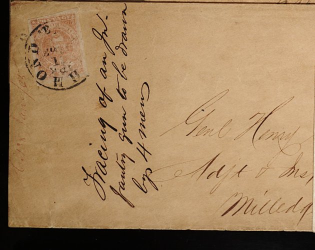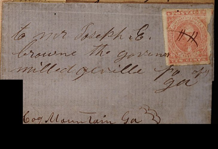 1222 c 5 image#5, 10c Rose, three large to ample margins, roughly separated at right ranging from just cut in to showing adjoining stamp, warm rich color, light horizontal crease at top, cancelled by pen stroke and tied by manuscript address to blue-gray folded letter, "Hog Mountain, Ga./16th July 1862" manuscript postmark at bottom, addressed to Mr. Joseph E. Browne, the Governor, Milledgeville, Ga., correspondence pertains to the acceptance of a Commission in the Confederate Army; serving as Governor from 1857-63, Joseph E. Brown was a force in Georgia politics for decades, a strong supporter of the Confederacy, and raised an army of 100,000 elderly men and young boys to oppose Sherman's "March to the Sea" in 1864; some reinforced aged fold splits, very fine for this; a handsome example of a rural Hall Co., Georgia usage. (Image) Est. 500-750