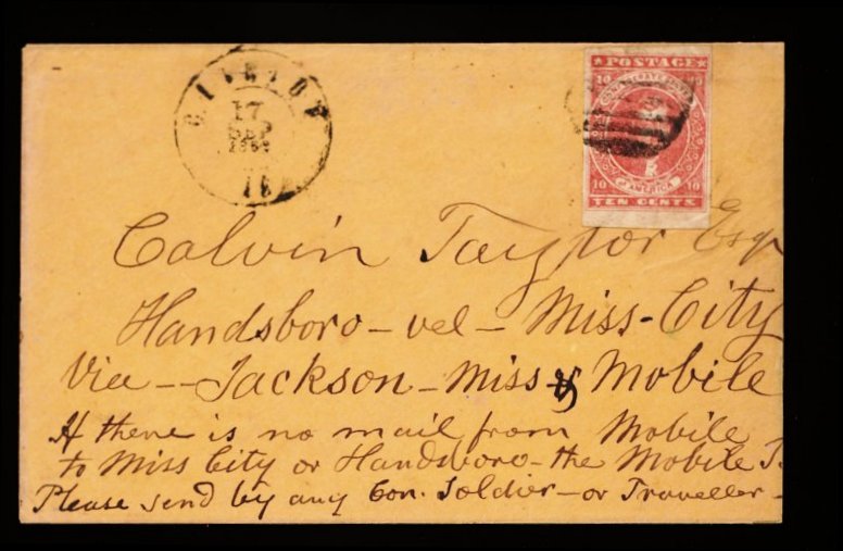 1223 c 5a image#5a, 10c Carmine, huge to ample margins all around, distinctive vibrant deep carmine shade, faint corner crease at lower left, tied by bar grid cancel to orange cover, with "Clinton, La./17 Sep 1962" c.d.s. at left, addressed to Calvin Taylor, Handsboro(ugh), Miss.; absolutely fascinating address docketing by the sender speaks to the fragile nature of the Confederate postal lines, Union forces were very active near Baton Rouge (30 miles to the south) at this time, sender suggests safer routings "via--Jackson, Miss, or Mobile", additionally he requests "If there is no mail from Mobile to Miss City or Handsboro.....please send by any Con(federate) soldier-or traveler"; slightly reduced at right, extremely fine; a true Confederate postal history gem with rare insight into the hardships of the postal system. (Image) Est. 4,000-5,000