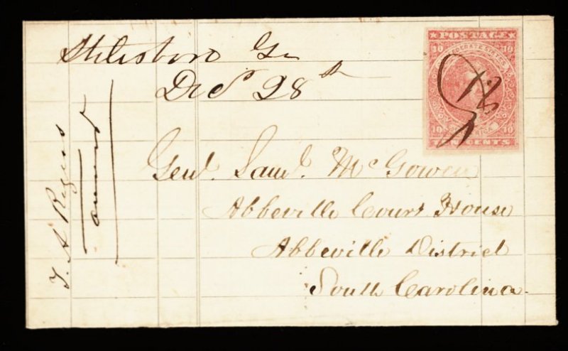 1224 c 5 image#5, 10c Rose, a lovely single with large to ample margins all around, warm rich color with crisp impression, fancy manuscript cancel and "Statesboro, Ga./Dec 28th" manuscript dateline on neat homemade small adversity cover made from a ruled prison ledger sheet, addressed to Genl Saml. McGowen, Abbeville Court House, Abbeville District, S.C., extremely fine; an attractive and eye-appealing usage of this popular general issue. (Image) Est. 500-750