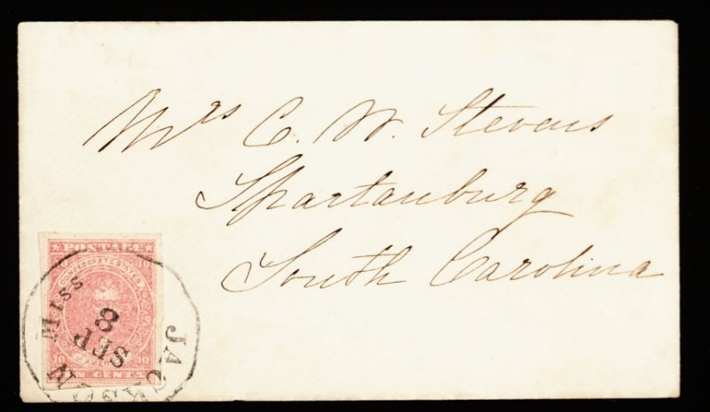 1225 c 5 image#5, 10c Rose, an especially handsome single, possessing large margins all around, strong fresh color and detailed impression, well tied by a superbly struck "Jackson Miss/Sep 8" c.d.s to a very clean cover addressed to Spartanburg, S.C., minor tears to flap at back, extremely fine; an usually choice example of the 10c Rose. (Image) Est. 500-750