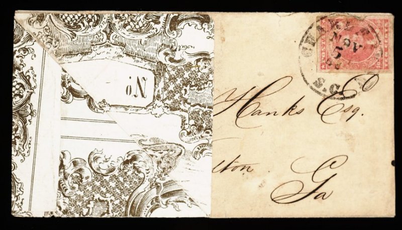 1227 c 5 image#5, 10c Deep rose, three large margins to cut in at right, warm rich color, tied by nice strike of a "Charlestown S.C./Nov 5 186(?)" c.d.s. to a stunning adversity cover made from a heavy glazed, gold and white printed fabric and dye label sheet, addressed to Dalton, Ga., flap at side turned for display, a few minor tears and reinforcements, still very fine; a very elegant and eye-appealing item. (Image) Est. 500-750