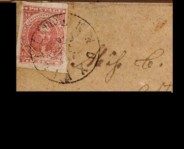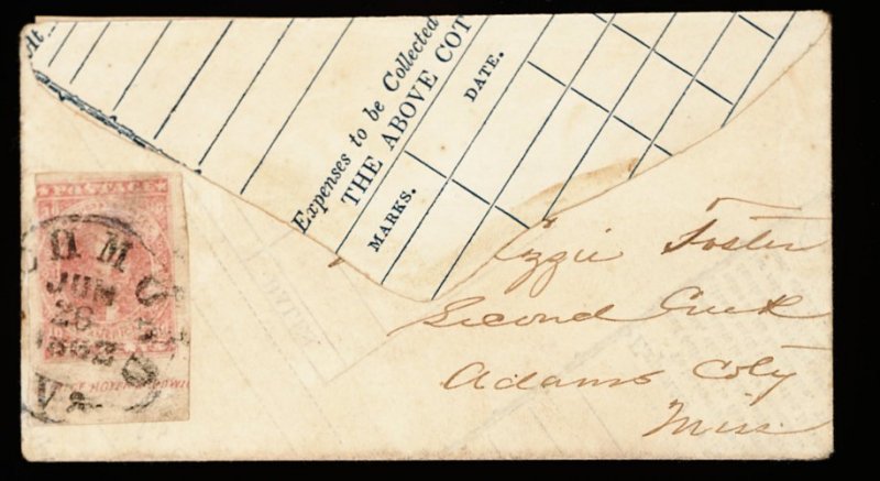 1237 c 5 image#5, 10c Rose, a showpiece bottom sheet-margin imprint single showing "LITH. OF HOYER & LUDWI(G)" portion of imprint, huge margins all around, inexplicably cut in at extreme top left, warm rich color, tied by "Richmond, Va./Jun 26, 1862" c.d.s. to marvelous small homemade adversity cover made from a printed shipping form used in the handling of cotton, addressed to Miss Lizzie Foster, Second Creek, Adams C(oun)ty, Miss.; imprint copies of any Hoyer & Ludwig stamp are very rare, copies on cover are almost never seen; flap at back turned to display shipping form, very fine and rare. (Image) Est. 2,000-3,000